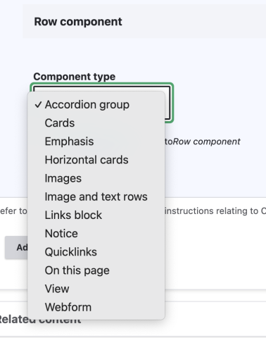 1. Under the "Row component" section, select the type you would like to use for your content.