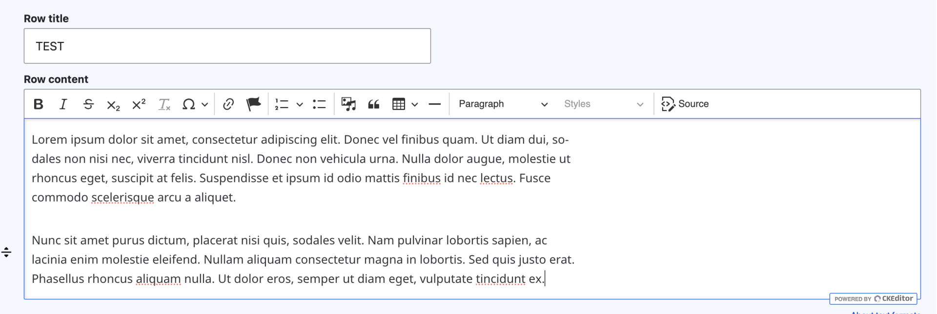 By default, a content row will always have two fields. A row title which will be styled as a H2 header for the row. The other is a field titled row content, this is where standard content is added.