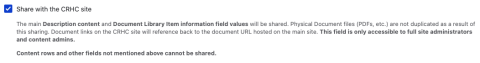 When checked, the main Description field and other Document Library Item information field values will be shared. Document files are not duplicated, and all document links on the CRHC sub-site will reference the document URL on the main site.