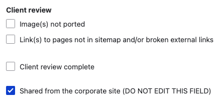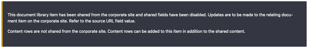 When this field is checked (done automatically by the feed importer), all fields that are part of the sharing feed will be removed and replaced with a warning message (a markup field) communicating that the document library item is shared from another site. This prevents users from updating content on the CRHC's side for any items that are shared from the main site. Do not edit the "shared from the corporate site" field for any reason.