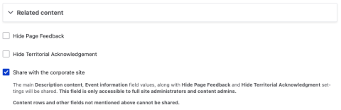 Event content type nodes that are created on a sub-site can be shared to the corporate site by checking the Share with the corporate site field under the Advanced settings tab: