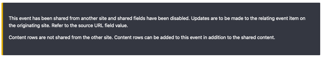 When this field is checked (done automatically by the feed importer), all fields that are part of the sharing feed will be removed and replaced with a warning message (a markup field) communicating that the node is shared from another site. This prevents users from updating content on the shared node instead of the source node. Do not edit the "shared from another site" field for any reason.