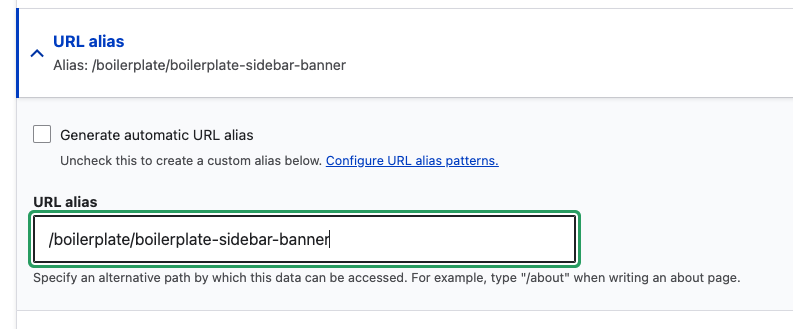 - Uncheck “Generate automatic URL alias” and then recheck it. This will regenerate the automatic alias.