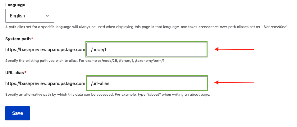 - By default, Drupal will create an automatic alias. If this page is in the menu, this alias likely reflects the page's position in the menu. If this page is not in the menu, Drupal may default to /node/123.